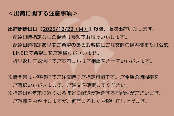 時間帯含む配達日時指定のご希望があるお客様は備考欄または公式LINEにてご連絡くださいませ。ご返信にてご相談・ご案内させていただきます。