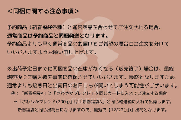 焙煎日と出荷日のお日にちが通常よりも開いてしまう可能性がございます。同梱をご希望される場合は予めご了承下さいますようお願い申し上げます。